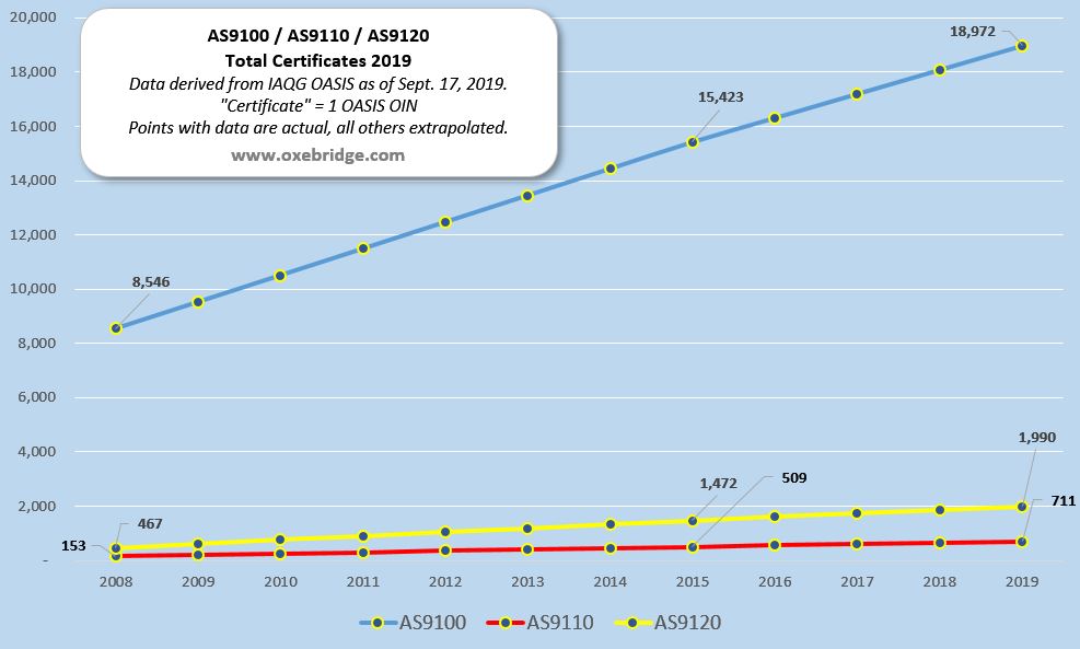 Coming on the heels of the release of ISO’s annual ISO Survey data, it’s worth examining whatever similar data we can get on AS certifications worldwide as well. This represents an analysis of AS9100, AS9110 and AS9120 data in the IAQG’s Online Aerospace Supplier Information System (OASIS) as of September 2019.