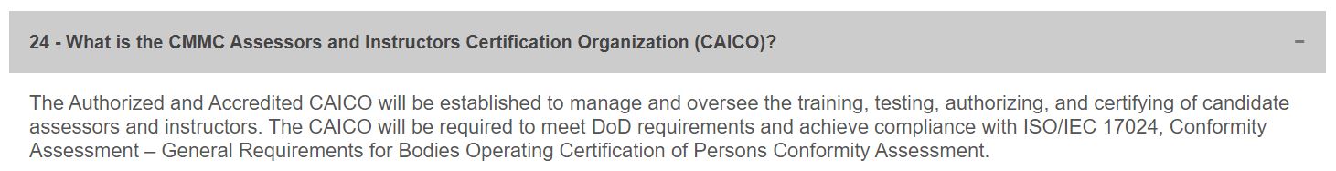 BTW, the Dept. of Defense buried news about the breakup of the CMMC-AB on its updated FAQ page, where it now declares that personnel certification will be performed by a new group called “CAICO,” this forcing the CMMC-AB to divest its training programs: