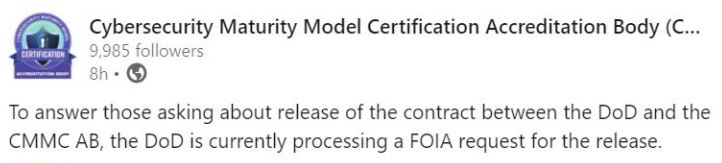 (Meanwhile, the DOD and CMMC-AB are refusing to release the contract for public review — an act which itself may be illegal, by the way — prompting journalists to demand it under the Freedom of Information Act. The CMMC-AB issued a bizarre statement on LinkedIn trying to toss the DOD under the bus (they really are great “partners,” aren’t they?), saying the DOD is processing the FOIA: