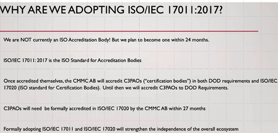 But a recent CMMC-AB Town Hall event included this slide, which appears to suggest that not only will the CMMC-AB become an official ISO 17020 accreditation body, but that only ISO 17020 accreditation issued by the CMMC-AB itself would be recognized: