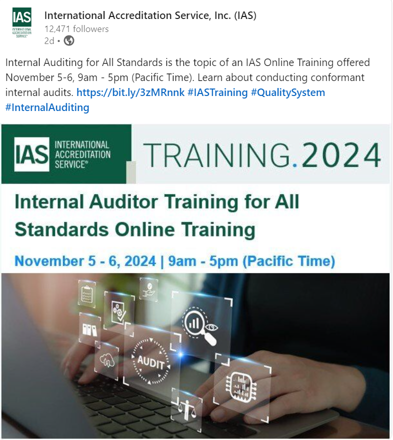 That ad alone is rife with conflicts of interest. You see, IAS is selling internal auditor training on “all standards,” including all the ones they do assessments on. Those standards include ISO 17021-1 and ISO 17025, both of which require (wait for it) internal auditing. So IAS is totally selling services for stuff they will audit later.