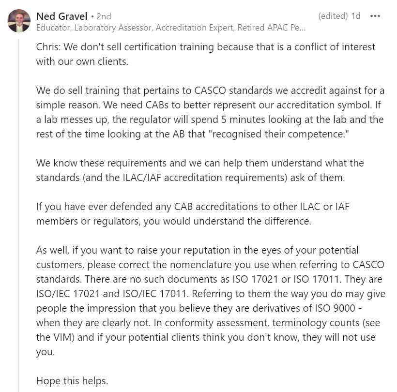 Meet Ned Gravel, who claims to be an experienced peer assessor with the Asia Pacific Accreditation Cooperation (APAC) and training manager for the accreditation body IAS. If you recall, I have a lot to say about both of those organizations, not much of which is good. The short version is that APAC is a corrupt shit-show, allowing any certificate mill it wants to get full IAF membership, and IAS is … well, problematic.