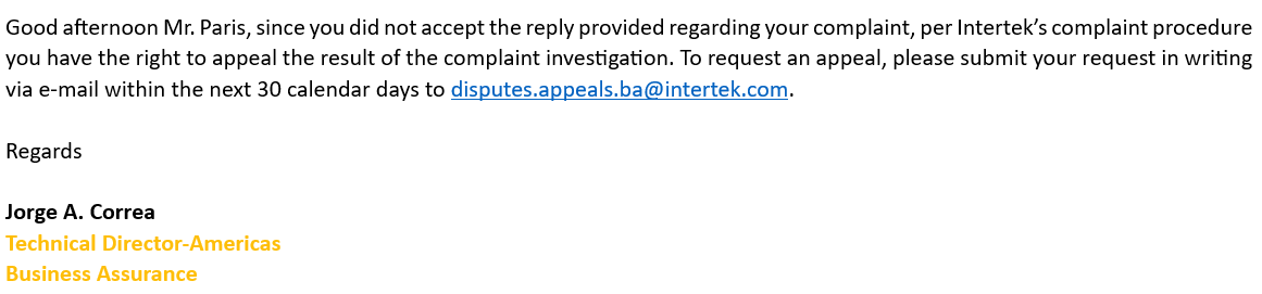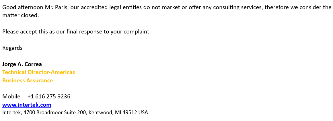 The issue wasn’t whether Intertek itself was consulting but about its partnership with Globizz, which Correa just “forgot” to look into. Then, when I rejected his response and reminded the putz that the matter was related to Globizz, Correa went full Dept. of Motor Vehicles and buried all accountability under a mountain of bullshit “procedures”: