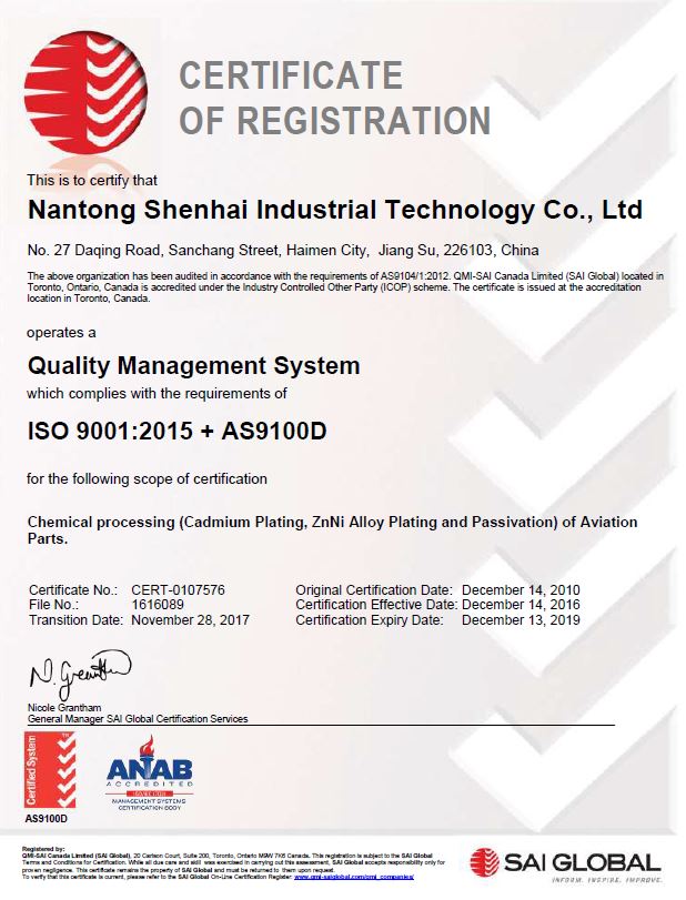 According to IAQG OASIS data, Nantong Shenhai is also certified to ISO 9001 and AS9100 by ANAB-accredited registrar SAI Global, the scope which includes the cadmium plating operations. That certificate is signed by SAI’s General Manager Nicole Grantham, whose signature also appeared on an AS9100 certificate issued to Pratt Whitney despite that company having been discovered to have 41 major AS9100 nonconformities after an independent audit by the US Dept. of Defense.