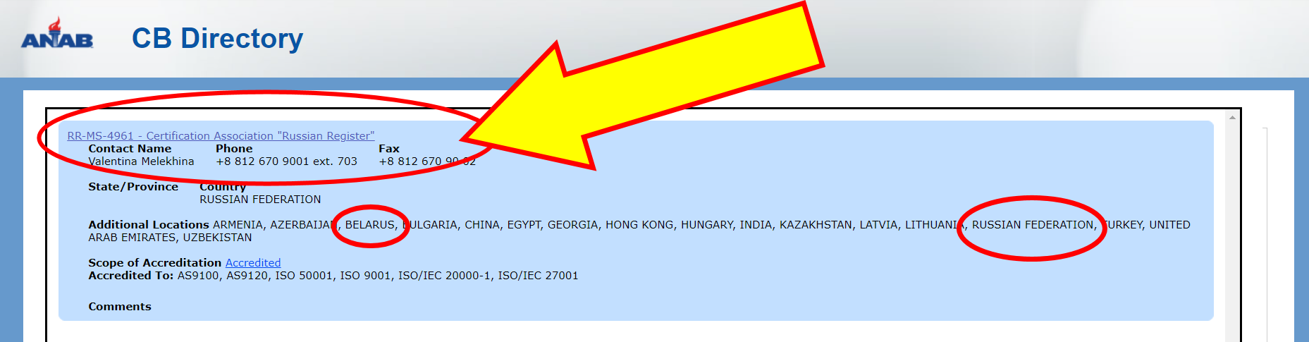 ANAB accredits the controversial certification body Russian Register, and its name appears frequently in marketing materials published by that body. As of this article, Russian Register is still listed on the ANAB site as accredited and includes sites in both Russia and Belarus.