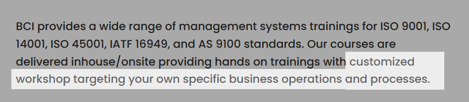 We offer a comprehensive range of learning services that cover management system standards such as ISO 9001; ISO 14001, and IATF 16949. Our training services are offered onsite (in-house) as coaching of small groups or one-on-one as needed during the development and implementation Our courses can be tailored to your company spending time focused on your business goals and objectives.