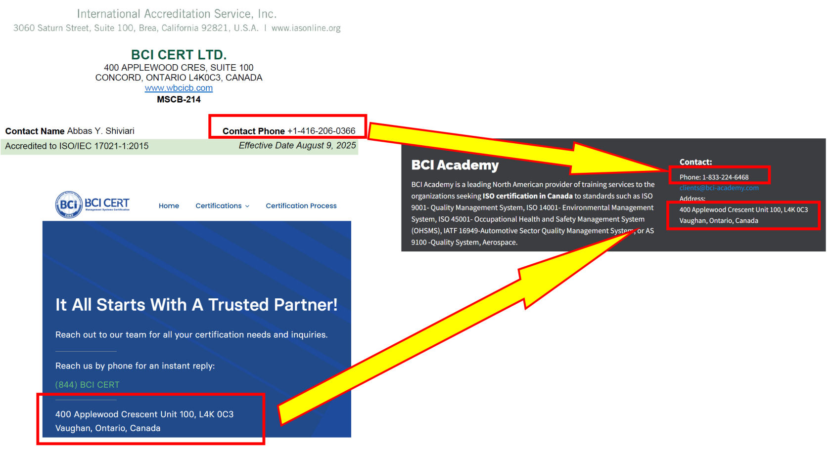 Meet BCI Cert, a CB located in Canada, but whose actual employees appear to be Iranian. IAS’s accreditation scope for BCI Cert lists the point of contact as one “Abbas Y. Shiviari,” A Canadian Chamber of Commerce listing also shows “AY Shiviari” as operating BCI Cert, but under the name “BCI Global.”