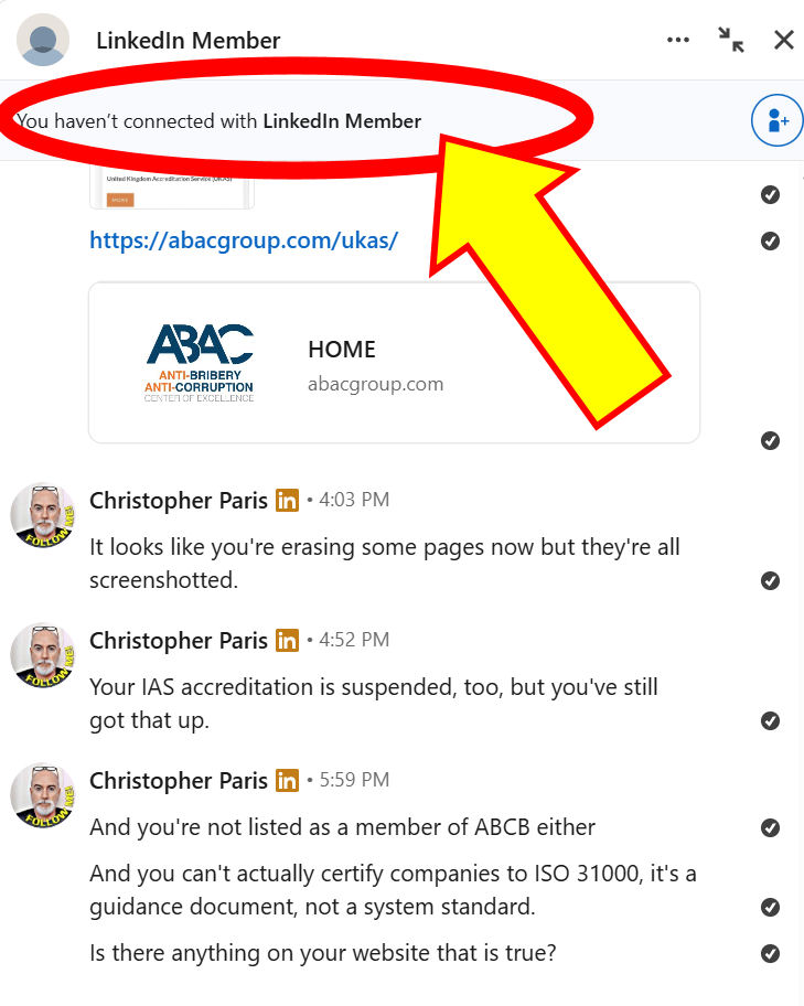 UPDATE 5 January 2026: I had been asking Zafar Anjum about his claims via direct message on LinkedIn, which is how I got his quote above. When I pressed him on the missing IAS accreditation, the lack of membership listing in ABCB, and how he can issue certificates to ISO 31000 (a guidance document), be blocked me. That is usually a good sign you are dealing with a scammer who knows he got caught. If Anjum has any explanations for his actions, he’s not giving them.