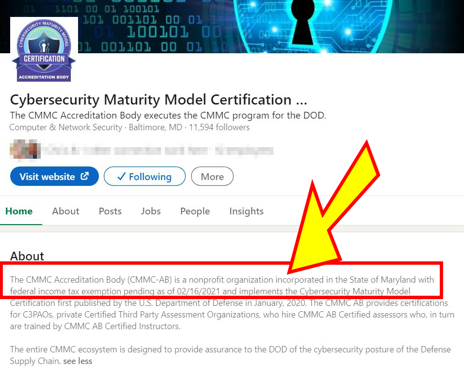 The CMMC-AB continues to make potentially fraudulent statements about its tax-exempt status. Both the IRS and the Maryland Secretary of State have confirmed with Oxebridge that the AB has not obtained official nonprofit status at either the state or Federal level, but the CMMC-AB LinkedIn page continues to declare itself a current “nonprofit” organization. It then adds a contradictory claim indicating the official status is “pending as of 2/16/2021.”