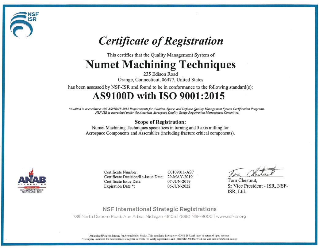The current As9100 certificate issued to Numet is signed by NSF’s former COO and Sr. VP Tom Chestnut. Chestnut’s LinkedIn page says he retired in 2021.