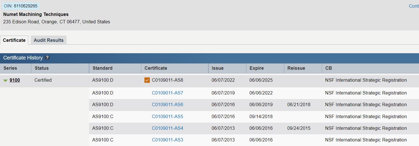The government found that Numet had made the claims between 2011 through 2016, and as a result, “was awarded 22 small business set-aside contracts that it was ineligible to receive.” Despite this, Numet held AS9100 certification from NSF-ISR since at least 2013, according to official IAQG OASIS results. Despite the public nature of the FCA lawsuit and settlement payments, it has since retained that certification without any interruption.