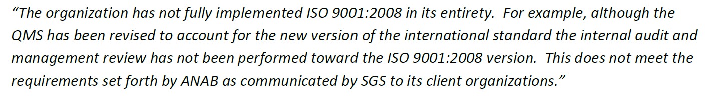 Dutifully, certification bodies like SGS and NQA went around writing nonconformities, and threatening to de-certify any company that hadn’t bought a copy of ISO 9001:2008, and updated their documentation to read “2008” instead of “2000.” Here is one such nonconformity written by SGS auditor Ernest Blanchard, who was ballsy enough to invoke ANAB in his writeup: