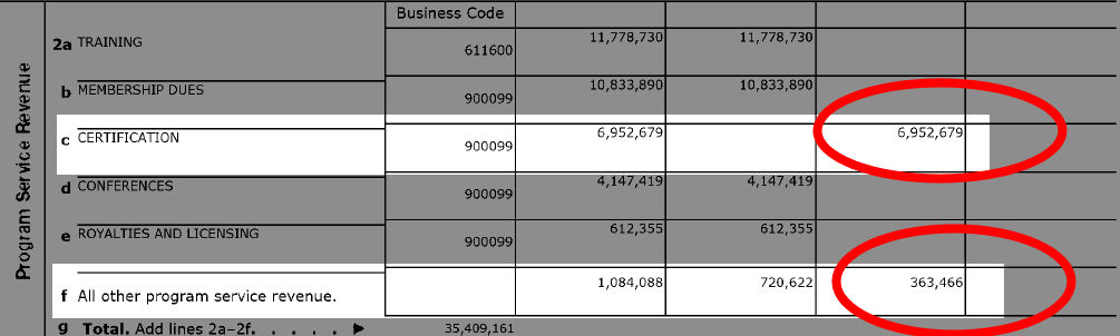 Next, the actual figures for certification income between the two forms don’t match. On Form 990, certification revenue is listed as $6,952,679. On the Form 990-T, however, it’s listed as $6,954,619. That’s a disparity of just under $2,000. No big deal, but I’m pretty sure the numbers ought to match.