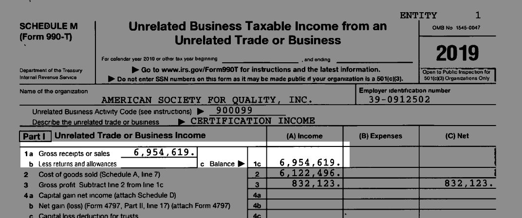 In analyzing the 2019 tax filings of ASQ, I noticed that the group had claimed over $7.3 million in unrelated business revenue. Normally, that’s subject to Unrelated Business Income Tax, or UBIT, but there was no record that ASQ had paid anything to the IRS. Also missing from the public filings found on Guidestar and ProPublica was the required filing of Form 990-T, which lists such payments and details of unrelated business income (UBI).