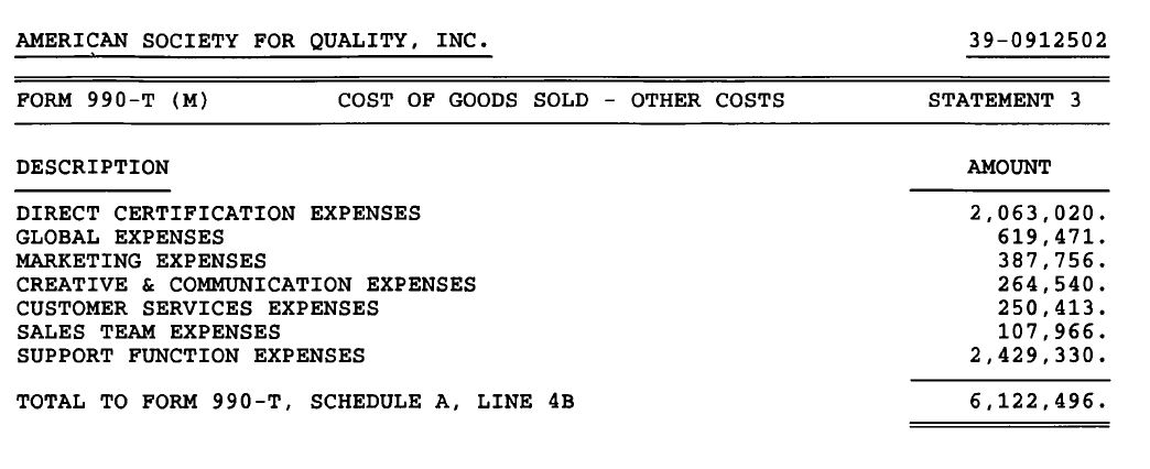Ironically, the other things sold by ASQ — like books and mugs and hats — would justify COGS, since they require physical raw materials to make. Yet ASQ didn’t claim any costs for those things, only the one thing a 501(c)(3) isn’t supposed to sell in teh first place: certifications.