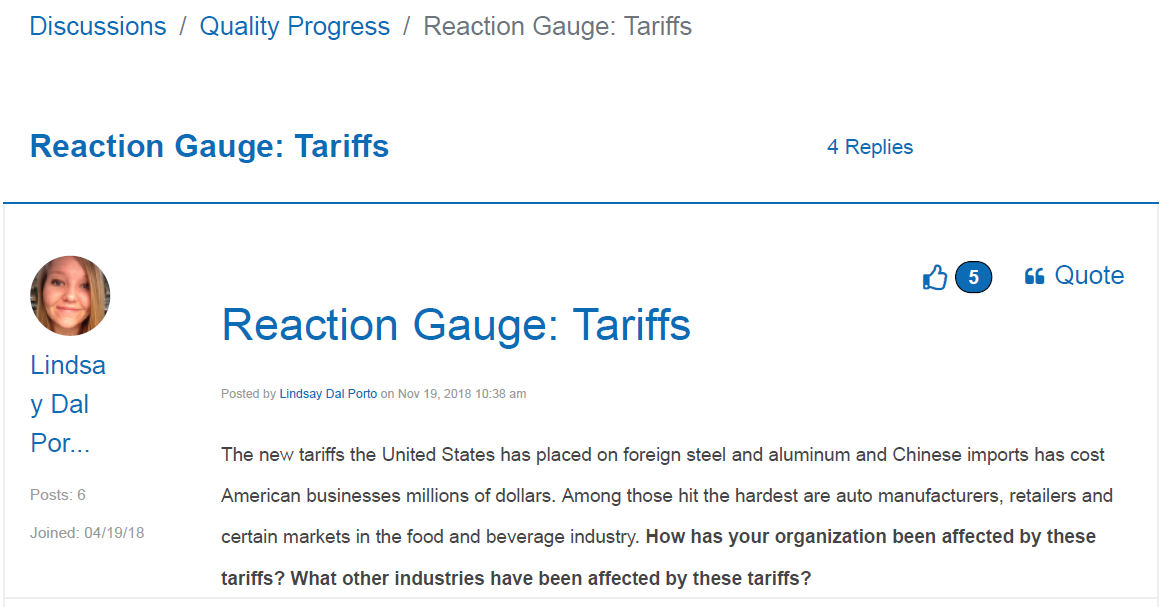 Back in November 2018 on the new MyASQ forum board, Lindsay Dal Porto ran a “reaction gauge” poll asking members how their companies have been impacted on US tariffs placed on China, framing it with an entirely anti-US, pro-China skew: