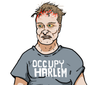 In THE AUDITOR, Musk is depicted as wearing an “Occupy Harlem” t-shirt to show that he’s simultaneously a racist twat but also someone who is desperately trying to appear young so you don’t notice he’s on his seventeenth mid-life crises, the fat fuck. He sports fresh hairplugs which are still bleeding.
