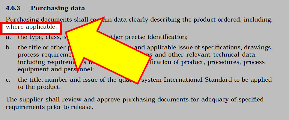 Now we go back to the earliest version of ISO 9001, from 1987. We see the same requirement, here called “Purchasing Data,” but prefaced with the term “where applicable“: