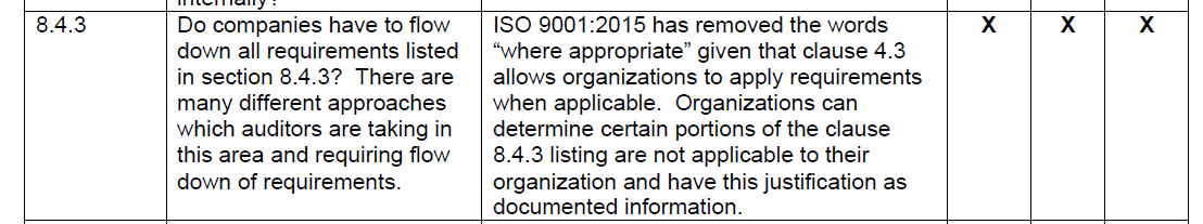 But here is where the IAQG screwed things up. In the final clarification, the issue was handed off to someone else, not Daniels. (It looks like this was Buddy Cressionnie, but I can’t be sure. It certainly smacks of his ability to screw things up.) The final ruling bungled the matter, and suggested companies can exclude the individual 8.4.3 bullet point from the scope of their entire QMS.
