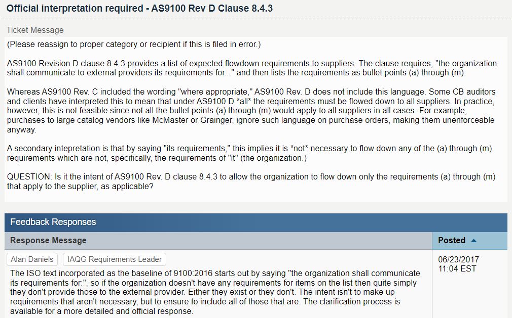 For AS9100, back in 2017 I sent an official request for interpretation through the IAQG OASIS ticket system. The issue was answered by Alan Daniels, who is not only the lead AS9100 developer, but also the Chair of the US TAG to TC 176…meaning I was getting the view for both AS9100 and ISO 9001. Look what Daniels wrote back, in the official OASIS response: