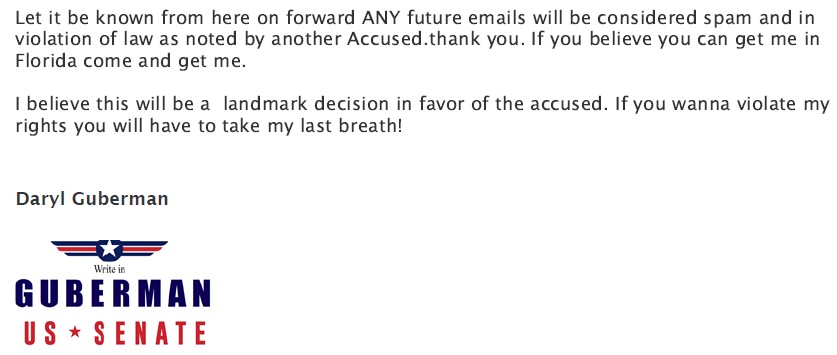 Guberman claimed to be running for US Senate and solicited campaign donations, but never registered as an actual candidate; at the time he was running, no election for Senate was even underway.