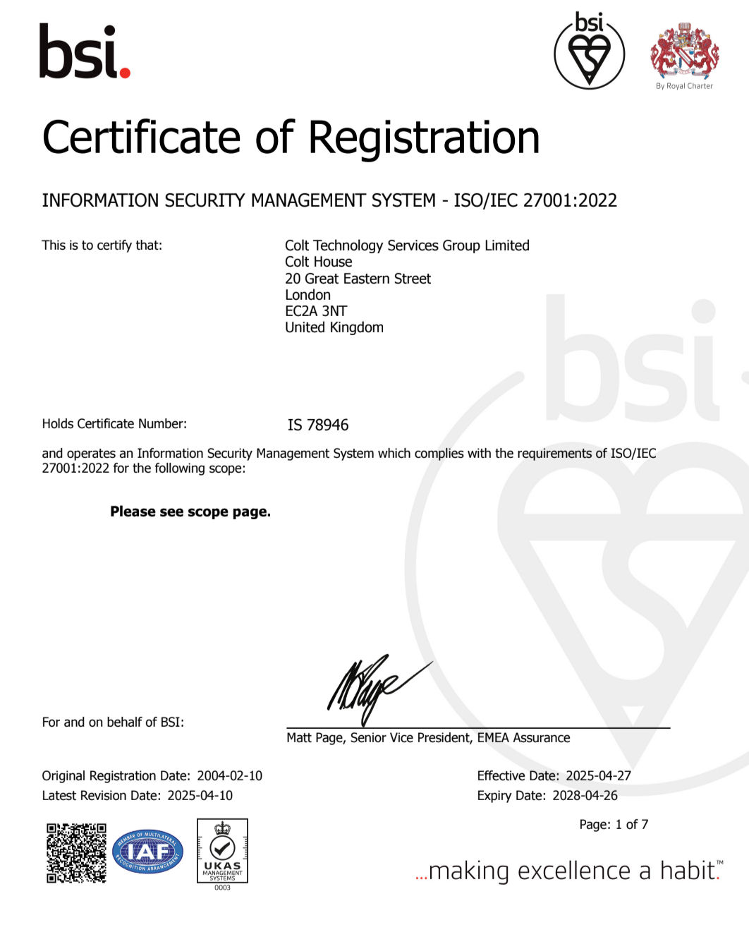 Colt holds ISO 9001 and ISO 27001 certification, both issued by BSI and accredited by the British national accreditation body UKAS.