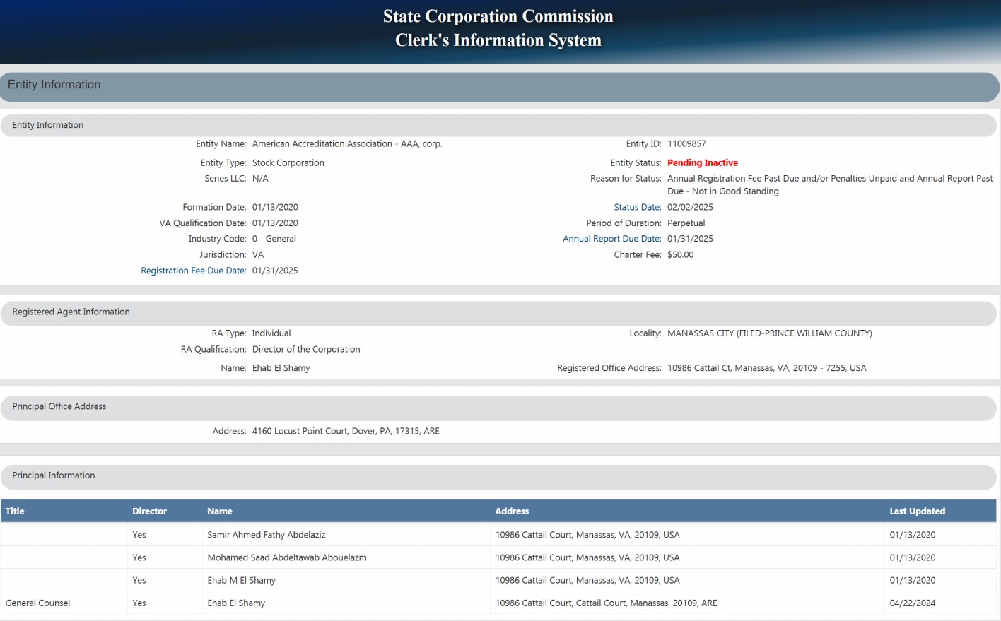 AAA is currently listed as “Pending Inactive” in official Virginia state records. That entry reads, “Annual Registration Fee Past Due and/or Penalties Unpaid and Annual Report Past Due – Not in Good Standing.”