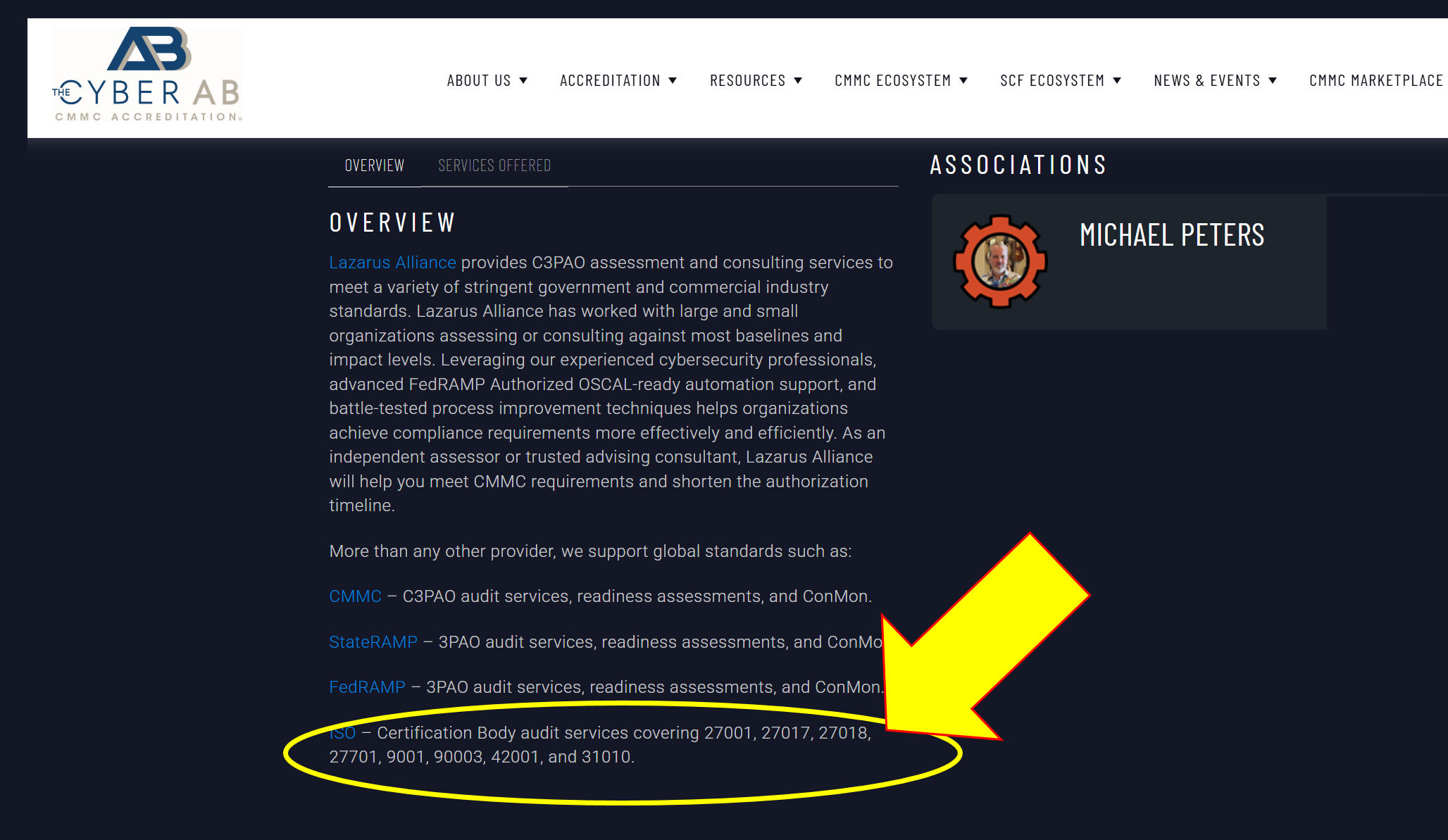 But Lazarus is leaning into their mill accreditation. On the official CMMC Marketplace site operated by the Cyber AB, Lazarus claims that it can provide “Certification Body audit services covering 27001, 27017, 27018, 27701, 9001, 90003, 42001, and 31010.” Some of those are not even standards you can get certified against, since they are guidance standards.