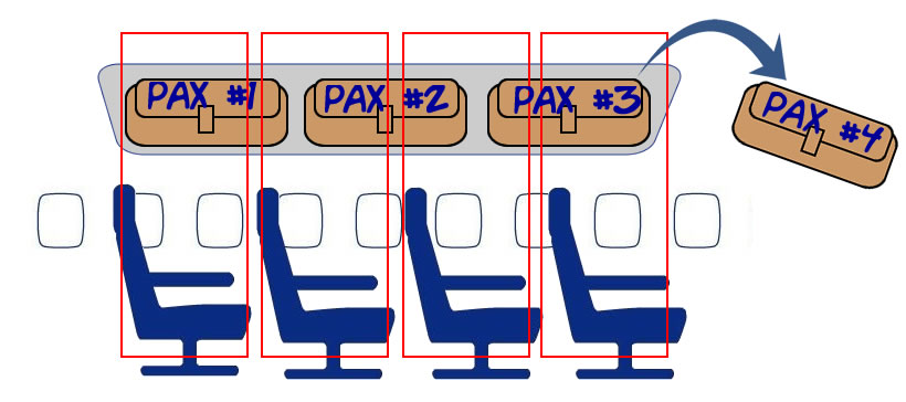 But when airlines compress seating to fit in more passengers, this breaks some basic considerations, and even laws of physics. If an airplane is designed to seat three people in a given space, the luggage space above is thus configured to handle three pieces of luggage of the airline’s pre-established and approved sizes. That might look like this: