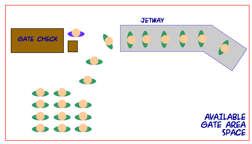 So whereas an airport may be built in 1980 to allow for a set number of people, based on 1980’s typical airline capacity, a typical gate may look like this: