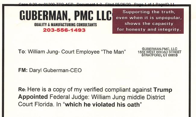 In his cover sheet, Guberman referred to Judge Jung as “Court Employee – ‘The Man’ .” Guberman has latched onto a sovereign citizen belief that Courts are corporations, and therefore not actual government bodies.