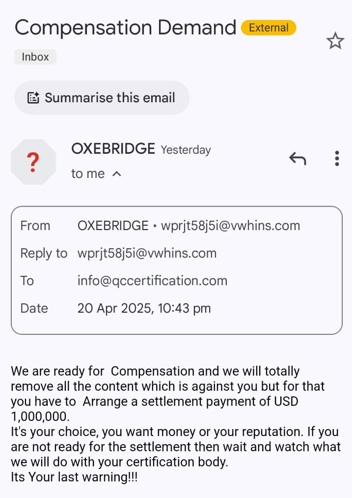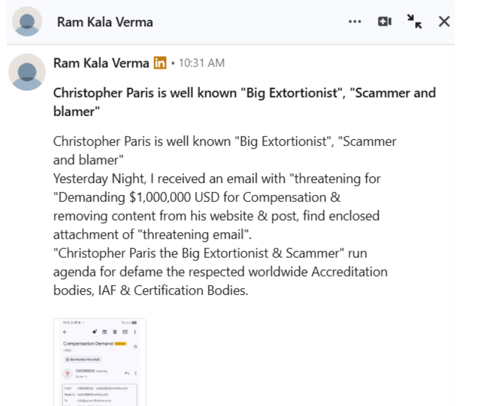 Certificate mill operator Ram Kala Verma, who’s run an ISO consultancy, certification body, and accreditation body all at the same time, thought he’d get out of his current problems by circulating a fake email intended to make it appear that I am demanding a million dollars from him.
