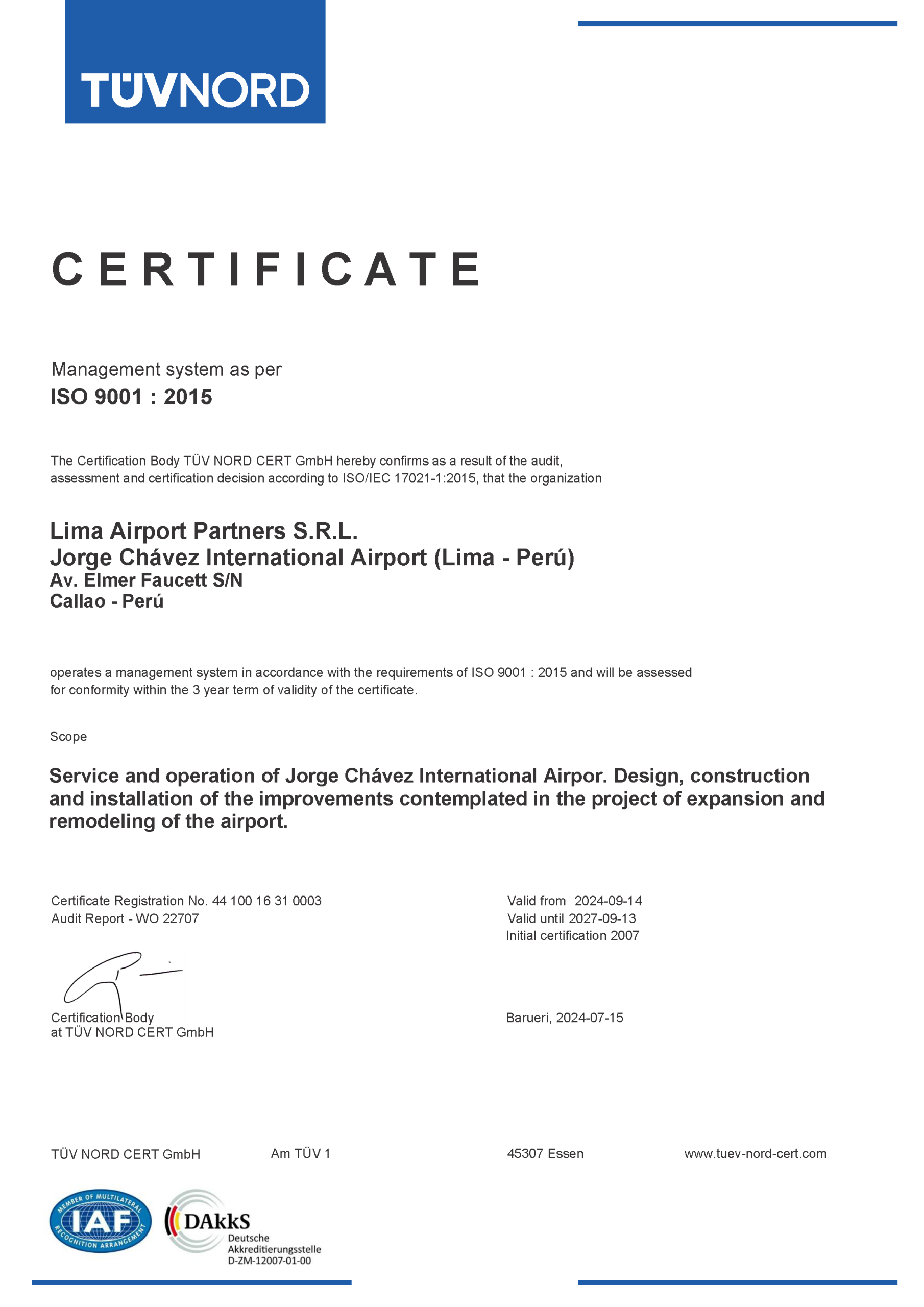 LAP, meanwhile, holds ISO 9001 certification from TUV NORD, and accredited by the German accreditation body DAkkS. The scope of that certificate is for “Service and operation of Jorge Chávez International Airport Design, construction and installation of the improvements contemplated in the project of expansion and remodeling of the airport.”