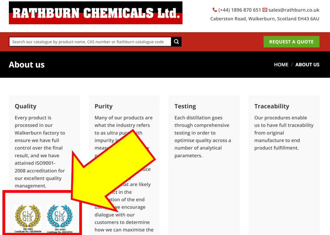 Despite this, Rathburn still claims to hold an ISO 45001 certificate for occupational health and safety. The Rathburn website shows an ISO 45001 certification mark with the certificate number “HSE230703” and bearing the logo of the known certificate mill CQS.