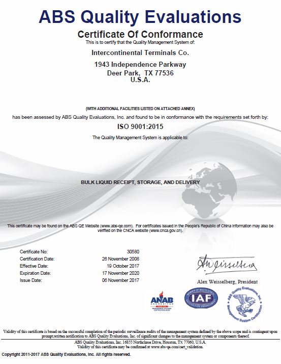 Intercontinental Terminal Company (ITC) has just extinguished a massive chemical fire at its Deer Park TX tank farm, where holding tanks filled with petroleum and other volatile chemicals burned benzene into the atmosphere, triggering a large-scale environmental health concern. At the same time, ITC holds an ISO 9001:2015 quality system certificate issued by ABS-QE for the scope of “bulk liquid receipt, storage and delivery.” The address indicated on the certificate is the same as that which burst into flames.