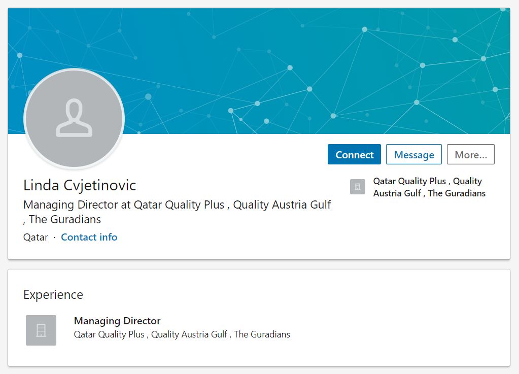 Despite the conflict of interest in working simultaneously for a consulting firm and certification body, Ms. Ross has been brazen in advertising her roles in both companies. Her name appears on multiple public websites and documents published by Qatar Quality Plus and Quality Austria. Using her married name “Linda Cvjetinovic,” she openly marketed her dual roles on her public LinkedIn profile. One source told Oxebridge, “Linda doesn’t care because she sees herself as so powerful, no one can hurt her.”