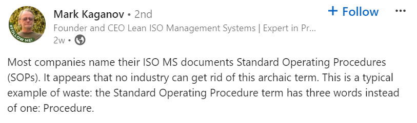 A few weeks later, he posted some silliness about a radical Lean idea: if you use the phrase “procedure” instead of “standard operating procedure,” you saved two whole words.