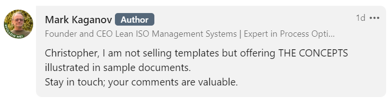 First, Kaganov is selling expensive ISO 9001 template kits. In fact, they run $240 a pop, and then you have to pay another $120 for a “process interaction matrix table,” and $120 more for a “context matrix.” I have no idea how Kaganov can provide a process matrix if he doesn’t know your processes, but whatever. But if you want all of them, you’re out nearly five hundred bucks.
