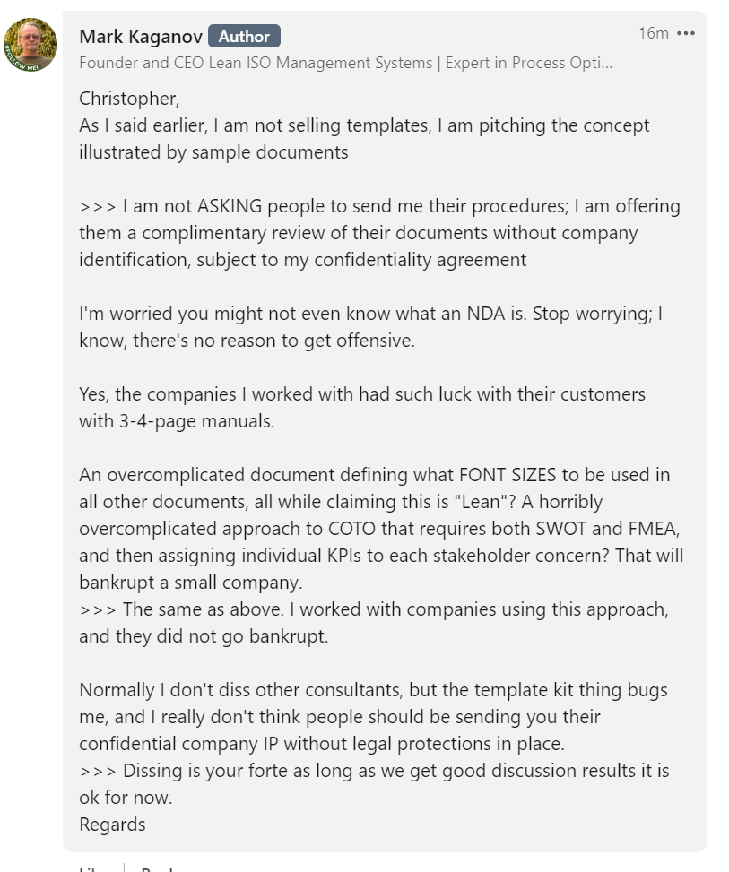 Kaganov started spamming me and the LinkedIn ISO 9001 group in an attempt to get people to join his own Lean ISO group. It’s not considered polite to spam one group to get people to defect to yours, but it’s also not explicitly prohibited. And it’s not like these groups compete, LinkedIn members can join a lot of groups all at once. So, I allowed some of his posts to get published, but behind the scenes, I spent a few days deleting his nearly hourly attempts to spam. It was getting annoying.