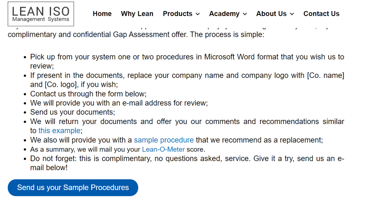 Then I noticed something even more worrying. Rather than merely harvest folks’ email addresses in return for the “free” gap analysis, Kaganov invites people to send them their company QMS procedures, and promises a free review. But he doesn’t enter into a nondisclosure agreement first, he just asks you to upload your company’s intellectual property without any protections whatsoever.