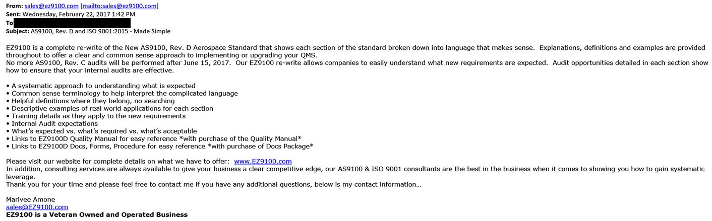 Singletary apparently doesn’t realize that sending out spam emails, like this one from the “sales@ez9100.com” email address, also constitutes “selling.” It always gives one pause to think that ISO business consultants don’t know the basics, like what “sell” means.