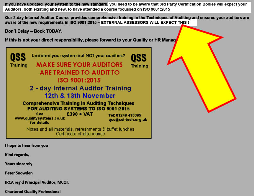 Meet the UK’s Peter Snowden, of Quality System Services (QSS) in Derbyshire UK. Mr. Snowden is sending promotional emails for his upcoming 2-day ISO 9001:2015 Internal Auditor Training classes while falsely claiming that such courses are mandatory per certification body (CB) requirements. In reality, CBs are disallowed from demanding anything not specifically stated in the ISO 9001 standard, and the standards says nothing about specific requirements for users’ internal auditors, and certainly nothing about requiring a “2-day” class from anyone, nevermind QSS.