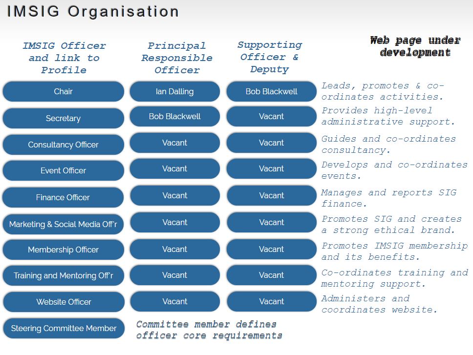 IMSIG doesn’t bother with stuff like international consensus or, you know, participation by actual stakeholders. By all accounts, it’s comprised of three people: IMSIG Chair Dalling (a private consultant), IMSIG Secretary Bob Blackwell (a private consultant and, of course, ASQ drone) and IMSIG Deputy Secretary Cheryl Burgess (also — yawn — a private consultant.) I’d love to tell you more about them, but I can’t because none of the links on their webpage work. A fourth slot (“IMSIG Deputy Chair”) isn’t even filled, even though the organization claims it’s been around since 1995. Meanwhile, the organizational chart is a massive set of bubbles showing 15 other “vacant” positions: