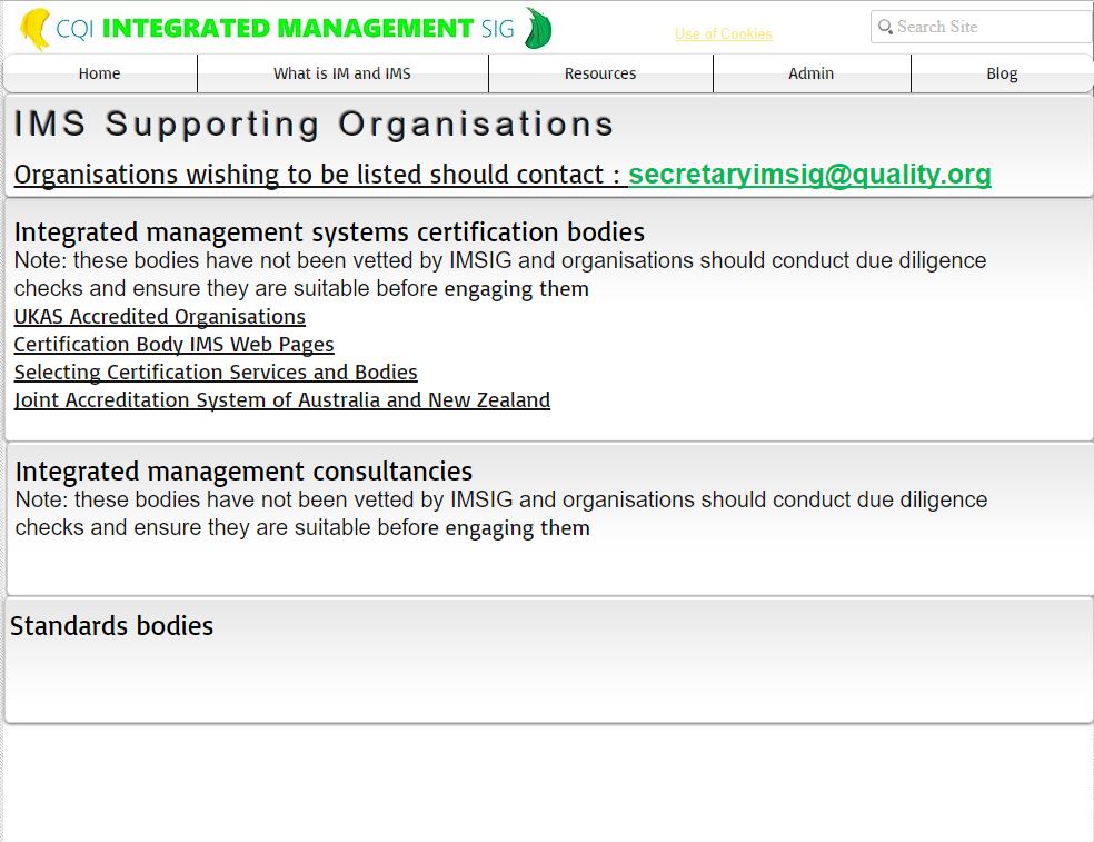 Next, the website lists “IMS supporting organizations” — which, at first, you’d think meant organizations supporting IMSIG itself. In fact, it’s just a list of two accreditation bodies (UKAS and JAS-ANZ) and some other registrars who have said something, at some point, about the concept of integrated management systems, but not anything supporting IMSIG the organization. Totally misleading, but even then that page is nearly entirely blank, with not a single consultancy or standards body listed: