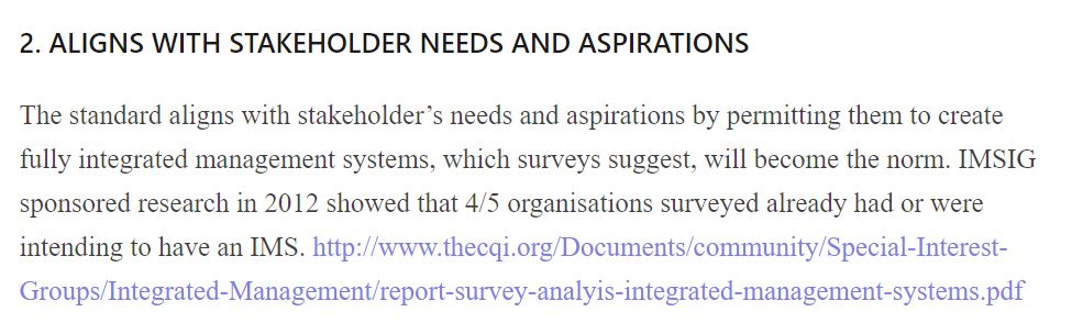 It’s also worth pointing out that the survey only included feedback from 184 companies, all in the UK, and all members of either CQI or IIRSM, and no one else. The authors admit that CQI has branched so far into other standards and concepts other than quality (such as environmental), that the CQI should consider renaming itself. By admitting this, the researchers essentially reveal they went directly to a group of respondents who were nearly guaranteed to have at least two management systems in place (quality + environment) which resulted in a biased finding.