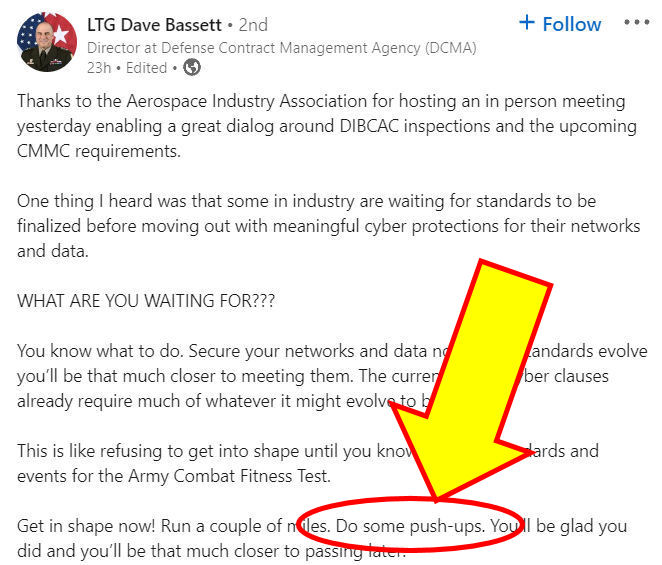 So I responded by reminding the Lt. General that CMMC and NIST compliance is very expensive, and not nearly as easy as doing “some push-ups.” And Bassett immediately deleted my comment.