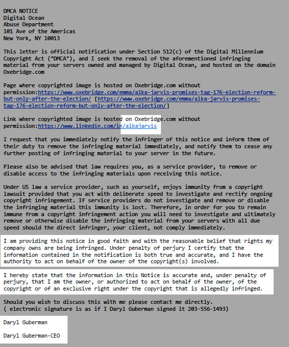 This isn’t the first time Guberman has alleged he is working for Palmes and Jarvis. Previously, he and his colleague Donald Norman LaBelle filed over 50 fraudulent Digital Millennium Copyright Act (DMCA) notices in an attempt to get the Oxebridge site taken off the internet. Ignoring the fact that that’s not how the internet works, Guberman and LaBelle essentially “scraped” the Oxebridge website for every graphic or illustration used, and then filed DMCA notices claiming — falsely — that they either created the images or owned them. Two articles featured the photos of Palmes and Jarvis, and so Guberman and LaBelle alleged they were hired as the official legal representatives of Palmes and Jarvis for the purposes of filing the DMCA notices, demanding their photos be removed. This is illegal for a number of reasons, not the least of which is that filing fraudulent DMCA notices is a violation of US Federal law, but also because it meant that Guberman and LaBelle were impersonating the attorneys of Palmes and Jarvis. Since the DMCA notices are filed under penalty of perjury, they also perjured themselves. A single false DMCA notice can result in a $25,000 hit, and — as I said — Guberman filed about 50 of them, meaning he could wind up paying $1.25 million. If Palmes are Jarvis were involved, then they would share that penalty.