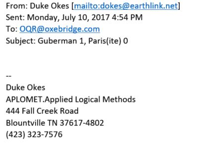 Stranger still is this email I received from ASQ Fellow Duke Okes, who wrote a content-free email to me with the subject line “Guberman 1, Paris(ite) 0,” after Guberman posted a video calling me a “parisite.” This shows that Okes is not only monitoring Guberman’s anti-Oxebridge content, but supporting it, even while Guberman accuses Okes of essentially working to foment terrorism by supporting Iran and North Korea.