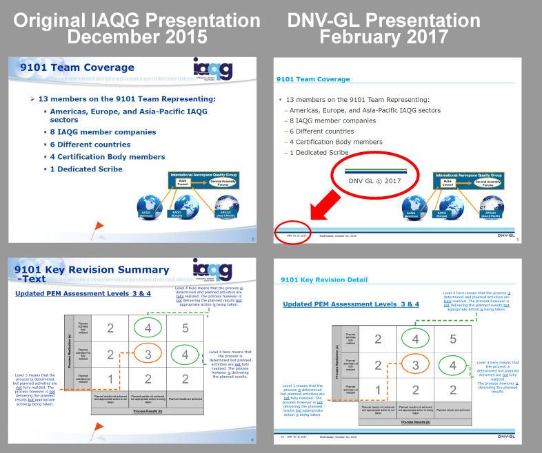 The Keys presentation adds a few original slides, but the entire body is comprised of the entirety of the original IAQG prez, which indicates it was created in December 2015 by the “IAQG 9101 Team.” The metadata on that file doesn’t list an actual person as the author.
