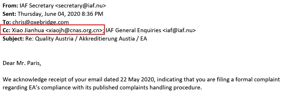 This has already occurred. As part of its international ISO Whistleblower program, Oxebridge often files or elevates complaints and appeals to both ANAB and the IAF. During the routine email exchanges with IAF, Nilsen has often cc’d communications regarding the complaints to Xiao directly. The example below comes from an email sent by Nilsen in June, acknowledging a complaint against a different IAF member accreditation body, and shows Xiao was copied on the communique.